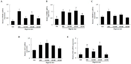 Effect of AE on the mRNA expression of genes involved in lipogenesis in the adipose tissue of the experimental mice. Mice were fed as previously indicated. (A) PPARγ, (B) C/EBPα, (C) SREBP-1c, (D) ACC, and (E) FAS. ND, normal diet, HD, high-fat diet, GE300, high-fat diet + Garcinia 300 mg/kg b.w, AE100, high-fat diet + 100 mg/kg b.w, AE300, high-fat diet + 300 mg/kg b.w. Values are expressed as mean ± SEM, n = 5. The varying superscript letters indicate a statistically significant difference among the groups by Duncan’s test of ANOVA, p < 0.05.