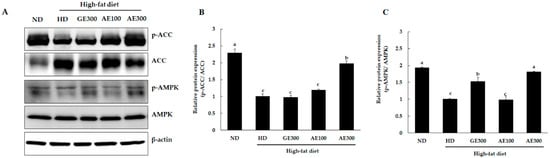 As shown in Figure 5, the results of western blot analysis revealed that AE300 and GE300 significantly increased the levels of p-AMPK compared to control HD. Simultaneously, the levels of p-ACC increased significantly in the AE300 group compared to the HD group. These data suggested that AE exerts its anti-obesity effect by upregulating the AMPK pathway, which in turn suppresses the action of lipogenic enzymes such as ACC by phosphorylation.