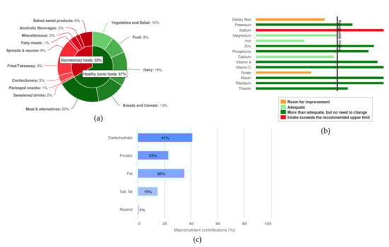 Examples of graphical feedback provided in the Australian Eating Survey® (AES) report: (a) proportion of energy intake from core and non-core food groups; (b) adequacy of fibre and micronutrient intake; and (c) proportion of energy intake from macronutrients.
