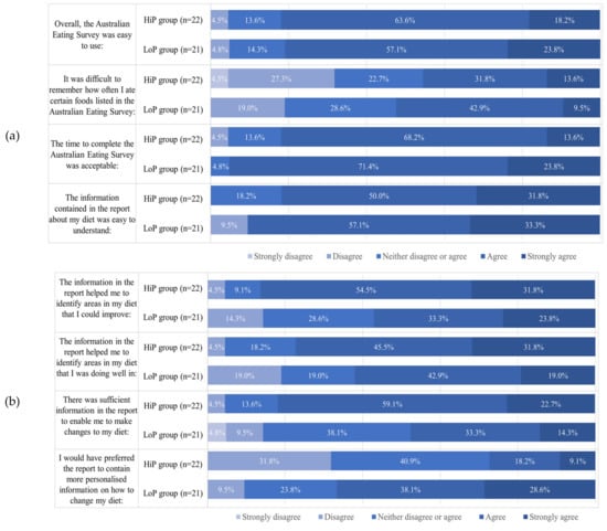 Figure 3a,b summarizes participant responses after completing the AES FFQ and on usefulness of the personalized dietary intake feedback report. The majority of participants in both groups found the AES easy to use, completion time acceptable (>80% strongly agreed or agreed), and the information in the dietary feedback report easy to understand (Figure 3a). A higher proportion of participants in the LoP group strongly agreed or agreed with the statement that it was difficult to remember how often some foods were eaten compared to the HiP group (52.4% vs. 45.4%, respectively). Differences between groups existed for the usefulness of the AES report in assisting with changing intake with a higher proportion of participants in the HiP group indicating that they strongly agreed or agreed with these statements compared to those in the LoP group, for most questions (Figure 3b).