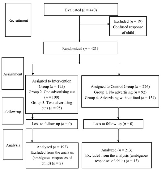 Various international multi-centric studies with heterogeneous populations have employed experimental methodologies similar to those in this study [29,30,31,32]. The most frequent experimental method is the exposure of the study subjects, in this case the children, to watching a cartoon TV show with commercial cuts in fitted-out rooms in the same school setting. It is a very usual methodology and of proved efficacy to evaluate the effect of advertising on the consumption preferences of children. In this study, the choice was to incorporate two control groups in order to minimize confusion biases. The decision to include a control group whose participants watch the same animation video with commercial cuts which include commercials for other non-food products has been made on account of previous clinical trials with similar hypotheses [33,34]. As regards the outcome assessment, based on the use of pairs of similar products shown to the study subjects, it has also been successfully employed in previous studies [18,31].