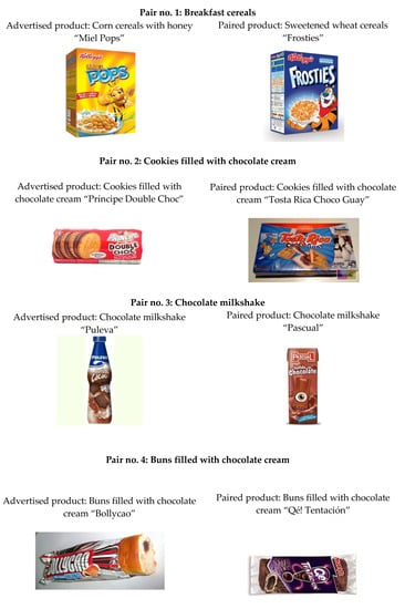 The children were invited to sit down in a room fitted out to watch cartoons. Afterwards, each child was individually directed to the research area. They were asked to select among some photographs shown in pairs, one of them with the article included in the commercial spot and the other showing a similar product. The products which were paired to the intervention participants were the following: