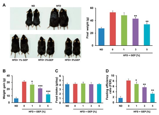 All animal experiments were approved by the Chungbuk National University, and were conducted in accordance with the approved protocols and guidelines established by the Chungbuk National University Institutional Animal Care and Use Committees (Approval No.: CBNUA-1128-18-01; approval date: 30 May 2018). After a week of acclimatization, mice were divided randomly into five groups and fed ad libitum with a normal chow diet (ND), high-fat diet (HFD), or HFD + 1, 3, or 5% GEP for 12 weeks (n = 6–7 mice per group). The dietary compositions used in this study are summarized in Table 2. During the 12-week experimental period, food intake was measured at 2-day intervals and body weight was measured once per week.