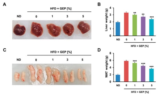We also found that 12 weeks of the HFD increased the size of the liver and epididymal WAT compared to the ND (Figure 2A,C) and significantly increased liver and total WAT weight; however, GEP treatment reduced weight in a dose-dependent manner (Figure 2B,D). These results indicate that GEP can reduce weight gain, which is an obesity parameter.