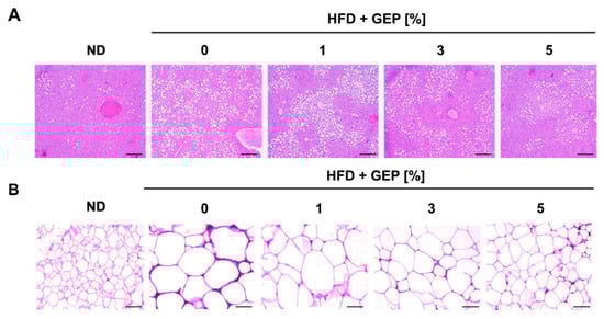 Liver and epidydimal WAT were stained to determine the effect of GEP on each tissue. The HFD group displayed greater fat accumulation than the control group, while GEP supplementation, particularly at 3% and 5%, attenuated lipid accumulation in the liver and reduced the size of adipocytes in epidydimal WAT (Figure 3A,B). Thus, GEP may reduce intracellular fat accumulation in both adipocytes and hepatocytes, which positively correlates with reduced obesity.