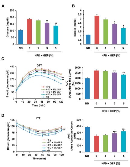 Next, we examined the effects of the HFD and GEP on glucose and insulin. After 12 weeks of treatment, the HFD increased serum glucose and insulin levels compared to the ND, while treatment with 1, 3, and 5% GEP for 12 weeks significantly reduced glucose and insulin levels in a dose-dependent manner, with a more pronounced effect on insulin levels (Figure 4A,B).