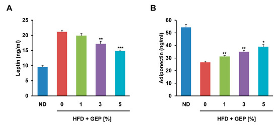 Next, we examined the effect of GEP on leptin and adiponectin in HFD-induced obese mice, observing that their production correlated positively and negatively with adiposity, respectively. GEP significantly increased and decreased leptin and adiponectin levels in a dose-dependent manner, respectively (Figure 5A,B), indicating that GEP may ameliorate adipokine regulation in obese mice.