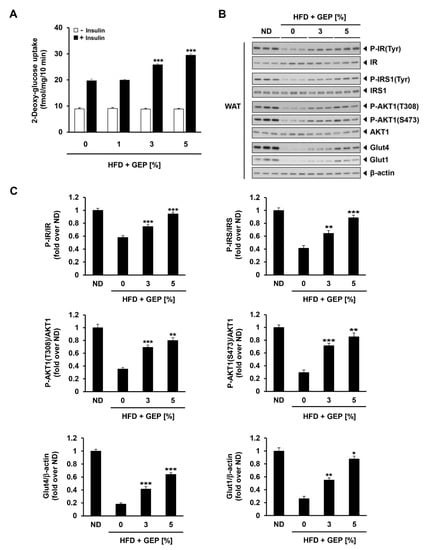 We also investigated GEP effect on glucose metabolism by assessing glucose uptake in the presence and absence of human insulin in WAT from 1%, 3% and 5% GEP treated HFD-induced obese mice, and the expression and activation of proteins involved in insulin signaling. In HFD-induced obese mice administered with insulin, GEP treatment dose-dependently improved glucose uptake (Figure 6A) and insulin receptor (IR), IR substrate 1 (IRS1), and AKT serine/threonine kinase 1 (AKT1) phosphorylation, thereby increasing glucose transporter type 4 and 1 (GLUT4 and GLUT1) levels as well as AKT1 activation at phosphorylation sites T308 and S473 (Figure 6B,C). These findings indicate that GEP supplementation may improve glucose metabolism.