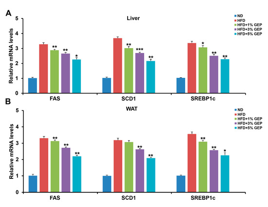 To confirm the effect of GEP on lipogenesis at the molecular level, we conducted genetic and protein analyses on WAT and the liver and analyzed fatty acid synthase (FAS), stearoyl-CoA desaturase 1 (SCD1), and sterol regulatory element-binding protein-1c (SREBP1c) expression using qRT-PCR. We found that the HFD increased the expression of lipogenesis-related genes (FAS, SCD1, SREBP1c) in both tissues compared to the ND, while 3% and 5% GEP attenuated the expression of all genes tested in a dose-dependent manner (Figure 7A,B). Together, these results confirm that GEP downregulates the mRNA expression of lipogenesis-related genes, thus inhibiting fat formation.