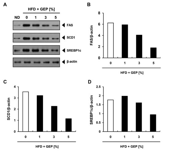 To investigate the effect of GEP on lipogenic protein expression, we performed western blotting using β-actin as the control (Figure 8A). Although HFD increased the ratio of lipogenesis-related proteins (FAS, SCD 1, SREBP1c) compared to β-actin levels, 3% and 5% GEP decreased this ratio (Figure 8B–D), suggesting that GEP inhibits lipogenesis and thus obesity.