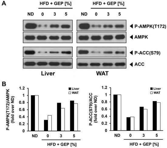 Effect of GEP on AMPK and ACC protein expression and activation. (A) Western blot analysis and the phosphorylation ratio of (B) AMPK and ACC in the liver and WAT of HFD-induced obese mice stated in fold over ND.