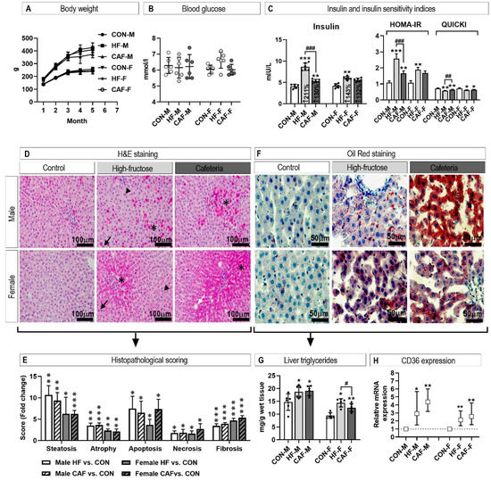 The influence of the treatments on body weight (A) and fasting blood glucose values (B). Insulin sensitivity was assessed as insulin concentration and insulin sensitivity indices, HOMA-IR and QUICKI (C). Photomicrographs of rat livers stained with hematoxylin and eosin (H and E) (D) and Oil-red (F). In High-fructose treated rats, note areas with apoptosis (asterisk), kariomegaly (arrow), and multinucleated hepatocytes (arrow head), and in Cafeteria diet treated rats, note areas with focal or diffuse apoptosis and necrotic cells (star) and focal macrovesicular steatosis (white arrow). Histopathological scoring is presented as fold change versus the control group (E). Lipid accumulation was further assessed by measuring hepatic triglyceride content (G) and hepatic CD36 expression. * p < 0.05, ** p < 0.01, *** p < 0.001 for the treatment versus the Control within the same sex. # p < 0.05, ## p < 0.01, ### p < 0.001 for the HF diet versus the CAF diet within the same sex. n = 6 for each group. CON, control diet; HF, high-fructose diet; CAF, cafeteria diet; M, males; F, females.
