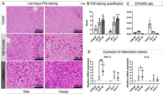 Photomicrographs showing a comparison of the storage products in the livers from the experimental rats (A). The appearance of hepatocytes stained with periodic acid-Schiff reagent (PAS), showing glycogen accumulation (glycogen stains magenta and nuclei are blue) and quantification of glycogen accumulation (B). Eicosaenoic/arachidonic (EPA/ARA) ratio suggesting a shift to more pro-inflammatory eicosanoids (C). The gene expression of the inflammation markers (Transforming growth factor-β and interleukin-6, TGF-β and IL-6) was assessed by the quantitative PCR (D). * p < 0.05, ** p < 0.01, and *** p < 0.001 for the treatment versus the Control within the same sex. # p < 0.05, and ### p < 0.001 for the HF diet versus the CAF diet within the same sex. n = 6 for each group. CON, control diet; HF, high-fructose diet; CAF, cafeteria diet; M, males; F, females.