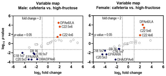 Sex had a significant influence on the fatty acid profile of the liver phospholipids (Figure 4D). Female rats had higher concentrations of n-3 fatty acids and n-6 fatty acids with 22 carbon atoms, while the concentration of n-6 fatty acids with 18 and 20 C atoms was lower in the female rats. Interestingly, the contents of C16:1n-7 and C20:3n-6 showed a treatment × sex interaction (Figure 4D). Nevertheless, besides the initial sex differences, the variables with the highest differences between the CAF and HF treatments were identical in the male and female rats (Figure 5).