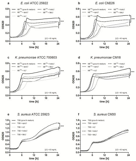 In case of K. pneumoniae (both reference and clinical strains), all tested forms of lactoferrin acted similarly. They significantly reduced the number of the Klebsiella population in comparison with the M9(+Fe) growth medium (Figure 2c,d).