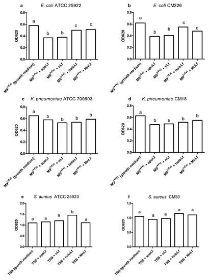 Optical density of pathogenic bacteria cultures after 24 h culture in the presence of various lactoferrin forms. E. coli ATCC 25922 (a), E. coli CM226 (b), K. pneumoniae ATCC 700603 (c), K. pneumoniae CM18 (d), S. aureus ATCC 25923 (e), S. aureus CM30 (f). All of the observed differences (bars without a common letter) were significant at p < 0.001 in one-way ANOVA.