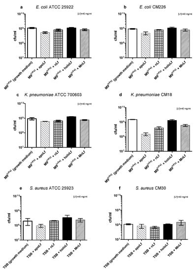 Quantitative assessment of tested pathogenic bacterial strains growth after 24 h incubation with various lactoferrin forms: E. coli ATCC 25922 (a), E. coli CM226 (b), K. pneumoniae ATCC 700603 (c), K. pneumoniae CM18 (d), S. aureus ATCC 25923 (e), S. aureus CM30 (f).