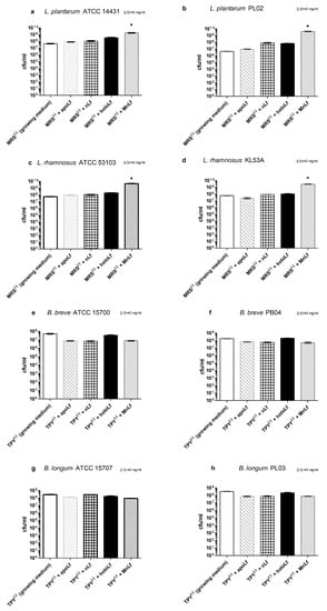 Quantitative assessment of tested strains growth after 24 h incubation with various lactoferrin forms: L. plantarum ATCC 14431 (a), L. plantarum PL02 (b), L. rhamnosus ATCC 53103 (c), L. rhamnosus KL53A (d), Bifidobacterium breve ATCC 15700 (e), B. breve PB04 (f), Bifidobacterium longum ATCC 15707 (g), B. longum PL03 (h). Statistical significance was evaluated for tested lactoferrin forms in comparison with the growth medium using one-way ANOVA, * p < 0.05. MRS, Man, Rogosa and Sharpe broth; TPY, trypticase-phytone-yeast broth.