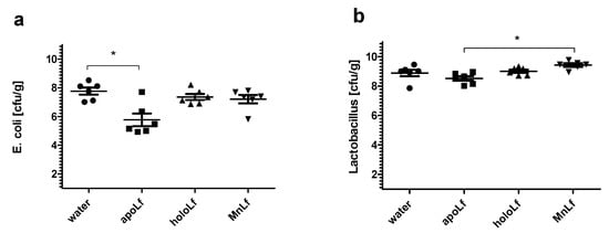 We observed a significant reduction in the population numbers of Escherichia coli upon administration of apolactoferrin (Figure 6a) in comparison with the control group (fed with vehicle only, which was water). Other forms of lactoferrin seemed to only mildly decrease the population numbers of E. coli (but no significant differences were observed). These results were in concordance with the in vitro experiments in which bacterial culture OD was the lowest for the apolactoferrin group in the case of both studied E. coli strains (Figure 1a,b). At the same time, metal-saturated forms of lactoferrin (both holoLf and MnLf) did not exhibit much impact on the E. coli culture OD, which was also the case in the in vivo setup.