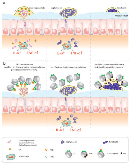 - Primarily, lactoferrin (particularly apolactoferrin) could provide mild bacteriostatic or potentially anti-biofilm forming activity towards Gram-negative rods, which was confirmed by in vivo studies. Additionally, our previous studies confirmed that Lf can counteract the proinflammatory effect of endotoxins by sequestrating them into an Lf-LPS complex and reducing the local inflammatory response in the gut [5] (Figure 7, left).