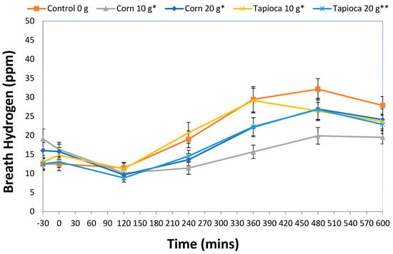 Mean ± standard error (SE) for breath hydrogen rated through 600 min. * Indicates statistical significance from control (p < 0.05). ** Indicates statistical significance from both Corn10 and Tapioca10 treatments (p < 0.05).