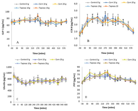 Blood was drawn into EDTA (Ethylenediaminetetraacetic acid)-coated vacutainers, mixed with a relevant preservative and centrifuged. The plasma was collected and stored at −80 °C until being assayed. Plasma samples were ethanol-extracted [] before being analyzed for GLP-1, CCK-8 and PYY3-36 using established RIA (radioimmunoassay) procedures [,]. Ghrelin was also measured via radioimmunoassay but used unextracted blood samples. For all analyses, samples were run in duplicate and all samples from a given participant were analyzed within the same batch. All 125I-Tracers used were purchased from PerkinElmer (PerkinElmer, Waltham, MA, USA). Antibodies for Ghrelin, PYY3-36 and GLP-1 were purchased from Bachem (T-4747, T-4090 and T-4056, respectively), while CCK-8 antibody C2581 was purchased from Sigma Aldrich (St. Louis, MO, USA). Detection limits and coefficient of variations (CV) for each of the RIA measured hormones are as follows: Ghrelin: 50–3200 pg/mL, inter-assay CV 13%, intra-assay CV 10%; GLP-1: 7.5–1000 pg/mL, inter-assay CV 12%, intra-assay CV 9%; PYY3-36: 3.7–250 pg/mL, inter-assay CV 14%, intra-assay CV 8%; CCK-8: 0.62–80 pg/mL, inter-assay CV 13%, intra-assay CV 8%.