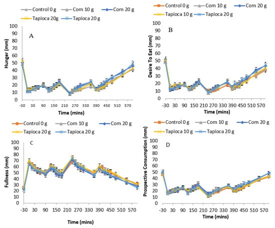 VAS (visual analogue scale) scores of hunger (A), fullness (B), desire to eat (C) and prospective consumption (D) rated from baseline through 600 min following control (triangles), Corn10 (diamonds), Corn20 (circles), Tapioca10 (star) and Tapioca20 (square) treatments. There were no statistically significant treatment differences observed (p > 0.05).