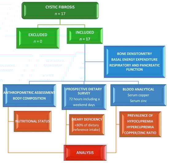 Detailed study methods regarding assessing zinc nutritional status in this series are reported elsewhere. Briefly, this nutritional study included an assessment of phenotypic characteristics, a blood test, a dietary survey, and a specific assessment of respiratory and pancreatic functions [30]. Figure 1 shows the flowchart of this cross-sectional study. In this series, the genotype of the participants, as well as the Norman–Crispin score (>5), the forced vital capacity (FVC% < 80%) and the forced expired volume in 1 s (FEV1 < 80%) to estimate respiratory sufficiency (SR) and insufficiency (IR), and the fat absorption coefficient (CFA > 94%) to evaluate pancreatic sufficiency (PS) and insufficiency (PI) were studied and published [30]. An abdominal ultrasound was taken to assess the digestive tract status.