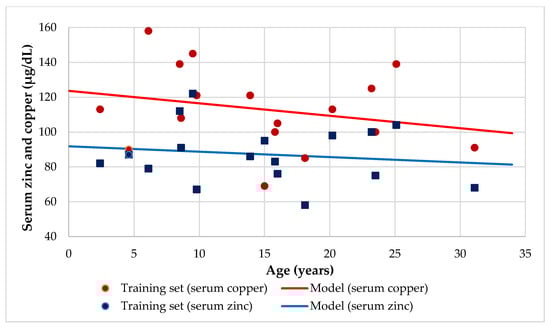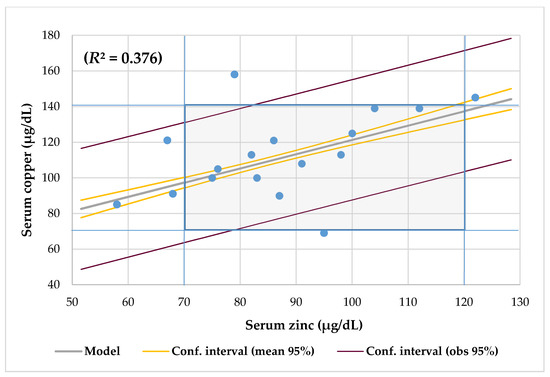 Regression serum copper (70–140 µg/dL) by zinc (70–120 µg/dL) adjusted for age and cut-offs.