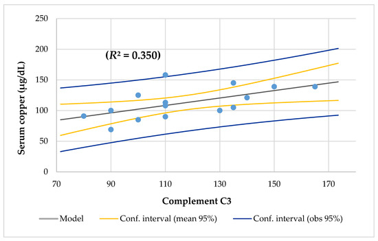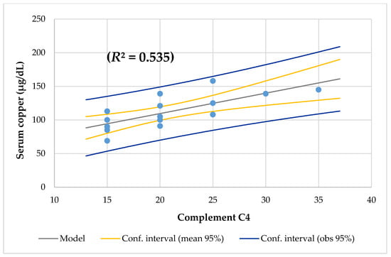 The mean Cu/Zn ratio of 1.32 ± 0.28 (Q1–3, 1.19–1.38) and range from 0.73 to 2.0 was higher than the normal value (range from 0.7 to 1.0) [37] and 94% of CF patients had a Cu/Zn ratio > 1.00. The mean Zn/Cu ratio was 0.79 ± 0.19 (Q1–3, 0.72–0.84) and ranged from 0.5 to 1.38. The Cu/Zn ratio had a direct and significant correlation with protein, monosaturated lipids, niacin intake, triglycerides, and gamma-glutamyl transpeptidase, and a negative association with polyunsaturated lipids intake and monocytes. Between the Cu/Zn and Zn/Cu ratios, there was a negative association (r = −0.998; p = 0.000). The found Zn/Cu ratio had almost the same associations but in an inverse relationship as the Cu/Zn ratio. All of them had a low percentage of lymphocytes T (CD3) and Th (CD4). Although the mean complement C3 (117 mg/dL, Figure 4), complement C4 (21 mg/dL, Figure 5), and lymphocytes NK CD16+56 (10.8%) were normal, linear regression analysis showed that all of them had a positive association with serum copper. CRP was slightly increased in the adolescent with hypercupremia. The CRP and ESR levels were correlated with the Cu/Zn ratio.