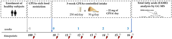 Capillary whole blood of each volunteer was collected by finger-prick at fasting state at eight timepoints during the study: (a) t00 (baseline): after the enrolment; (b) t0: after a 1-week washout period (dairy products and bovine meat restricted diet); (c) t1, t2, t3, t4, t5, t6: twice a week during the dietary treatment under a free-living diet with a controlled CPFAs intake for three weeks. All capillary blood samples were collected in heparin fluoride tubes, centrifuged for 2 min at 10,000 rpm (Centrisart® A-14 Micro-Centrifuge, Sartorius GmbH, Göttingen, Germany). Finally, the upper plasma layer was withdrawn and divided into two aliquots (240 µL), dried under vacuum and stored at −80 °C until fatty acids analysis. The study design is shown in Figure 1.