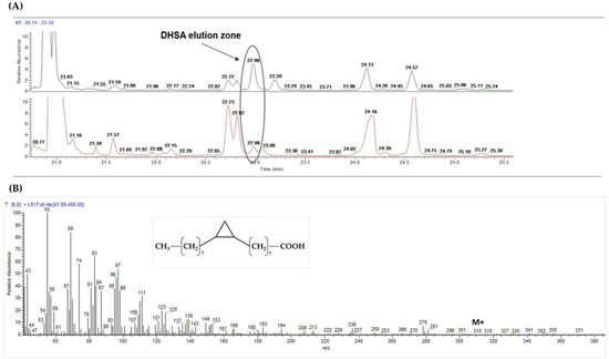 CPFAs, have been detected and quantified by GC-MS according to Caligiani et al. (2016) [20] as the sum of two isomers (DHSA and lactobacillic acids) and as minor components in the total plasma fatty acid profile of all volunteers and at each timepoint. The identification of CPFAs signal (see Figure 2) was supported by the retention time and the full SCAN mass spectrum of CPFAs signal detected in human plasma samples, that are identical to those detected in the spiked sample of the FAME extract from plasma by DHSA pure standard methyl ester (the major isomer).