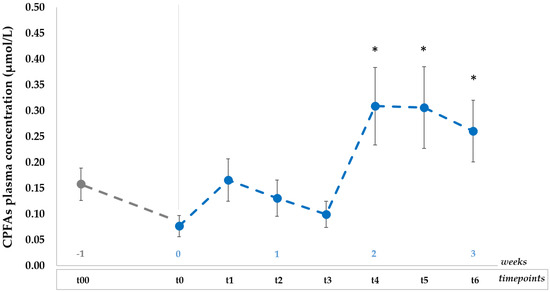 After one-week of diet with low CPFAs intake, the plasma CPFAs mean concentration decreased (t0, 0.08 ± 0.02 µmol/L) but was not significantly different (p ≥ 0.05) from the basal level (t00, 0.16 ± 0.03 µmol/L). On the contrary, significant changes (p < 0.05) were observed after CPFAs controlled intake when compared to that measured after the washout (t0), peaking at t4 (0.31 ± 0.08 µmol/L) and at t5 (0.31 ± 0.08 µmol/L) after two weeks of dietary treatment. Moreover, CPFAs plasma level was significantly higher (p < 0.05) at last timepoint (t6, 0.26 ± 0.06 µmol/L) than the concentration measured at t0 (washout).
