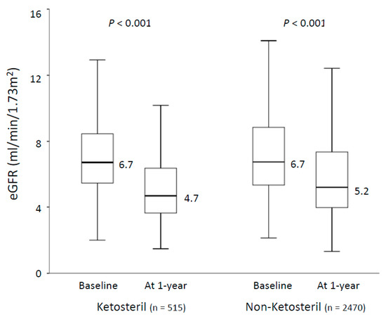 The eGFR significantly declined in both study groups (Ketosteril group: from 6.7 to 4.7 mL/min/1.73 m2; non-Ketosteril group: from 6.7 to 5.2 mL/min/1.73 m2) whereas the range of renal function decline did not significantly differ between the groups.