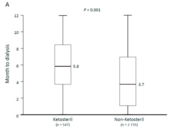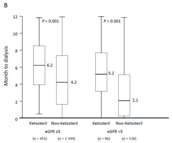 Median duration from the index date to the day of initiating the dialysis of patients in the Ketosteril and non-Ketosteril groups in the whole study population (A) and stratified by baseline eGFR level (B). The lower whisker is the first quartile minus 1.5 times the interquartile range and the upper whisker is the third quartile plus 1.5 times the interquartile range.