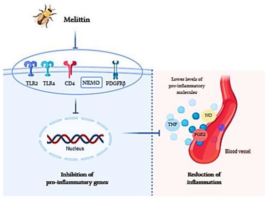 Furthermore, as melittin is the compound most studied of BV, a series of biological properties have been studied. The anti-inflammatory activity of melittin is produced by various mechanisms. Principally, this mechanism consists in blocking the toll-like receptors (TLR) 2 and 4, the cluster of differentiation 14 (CD14), and the platelet-derived growth factor receptor beta. Moreover, melittin has an inhibitory effect of the nuclear factor kappa-B (NF-kB) essential modulator. All these pathways have the final effect of liberating, to the extracellular medium or the blood vessels pro-inflammatory molecules like inflammatory cytokines, tumor necrosis factors (TNF), nitric oxide (NO) or prostaglandin E2 (PGE2). All these molecules produce inflammatory effects on tissues; therefore, the capacity of melittin to cause the inhibition of the production of these molecules proves its anti-inflammatory effect []. At this sense, a scheme of how melittin acts on the inflammation process is shown in Figure 2.