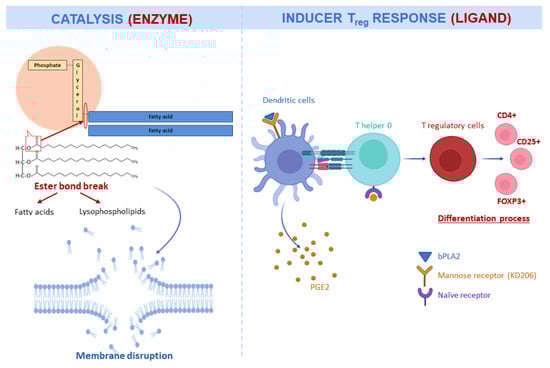 bPLA2 is usually considered the major allergen of BV and can upregulate the expression of Foxp3 and thus promote regulatory T (Treg) cell differentiation by the release of PGE2. This ability proposes bPLA2 as an alternative treatment for neuroinflammatory diseases as they mediate anti-inflammatory effects [,]. A representation of this regulated expression pathway is shown in Figure 4 [,]. This Treg expression has been demonstrated to modulate apoptotic signalling and therefore, it possesses immunomodulatory properties []. Meanwhile, bPLA2 can induce a T helper type-2 (Th2) response that is dependent on MyD88 expression in T cells, inducing an immune protective response against future BV exposure []. At last, other studies have investigated homologs of bPLA2, such as mammalian PLA2G3, and found that when they are coupled to fibroblast lipocalin-type PGD synthase (L-PGDS), they produce a lipid mediator (in this case, PGD2) that binds to type-1 PGD receptor facilitating mast cell maturation and inducing anaphylaxis [].