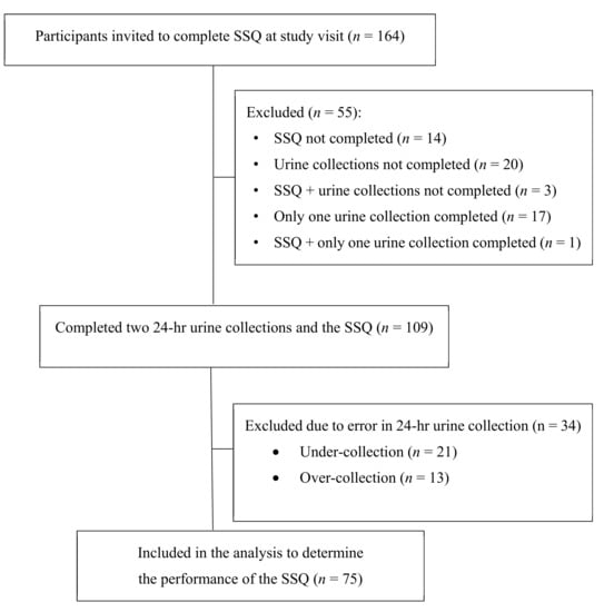 As shown in Figure 1, one hundred and sixty-four participants were invited to complete the SSQ and two 24-h urine collections. Fifty-five participants were excluded due to not completing either the SSQ and/or two urine collections, leaving 109 participants. Of the 109 participants, a further 34 were excluded due to a 24-h urine sample being incomplete (under-collection, n = 21) or being over-collected (n = 13) (Figure 1). Participants with an under-collected urine sample were more likely to be female and have a higher BMI, whereas those who over-collected had a higher 24-h urine sodium excretion, as expected (p < 0.01, Supplementary Table S1).
