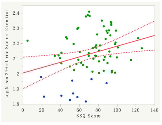 Graph showing the correlation between the SSQ score and log mean 24-h urine sodium showing the line of fit (solid line) (r = 0.29; p = 0.01) and confidence curves for the fitted line (dotted line and shaded area). Green dots represent participants with 24-h urine Na ≥ 100 mmol/day and blue dots with Na < 100 mmol/day.