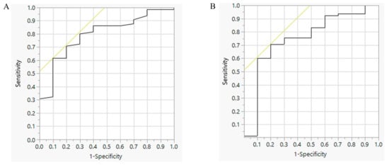 The mean SSQ score of the study population was 73 ± 23 and was lower in participants with 24-h urine Na < 100 mmol/day (24-h urine Na < 100 mmol/day: 53 ± 21; 24-h urine Na ≥ 100 mmol/day: 76 ± 22; p < 0.01). The relationship between the SSQ score and the log mean 24-h urine sodium excretion was weak (r = 0.29; p = 0.01) (Figure 2). By multivariable analysis (gender, height, BMI, weight, systolic blood pressure and the SSQ score), only the BMI and SSQ score were significantly associated with the log mean 24-h urine sodium excretion (p < 0.01). By the ROC analysis, an SSQ score of 74 was the optimal cut-off point to predict 24-h urine Na ≥ 100 mmol/day, with an area under the curve (AUC) of 0.79 (p < 0.01) (Figure 3A). The ROC analysis for BMI alone demonstrated that a value of 24.7 kg/m2 was the optimal cut-off point to predict 24-h urine Na ≥ 100 mmol/day, with an AUC of 0.75 (p = 0.02) (Figure 3B). The performance characteristics of the SSQ and BMI are shown in Table 2. Furthermore we evaluated the performance of the SSQ in participants with BMI ≥ 25 kg/m2 (n = 46) and <25kg/m2 (n = 29) and the results showed that the accuracy improved to 100% in the former (p < 0.01) but was not significant in the latter group (AUC = 0.72, p = 0.13) (Table 2).