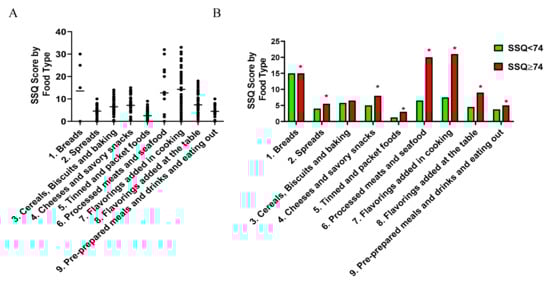 Characteristics of sodium-rich food types in the study population according to absolute SSQ score values. Panel (A) shows the absolute scores for each sodium-rich food group for the total study population (n = 75) and Panel (B) shows the median percentage scores divided into groups that had SSQ score < 74 (green) (n = 34) and SSQ score ≥ 74 (red) (n = 41). * p < 0.05 compared to SSQ < 74.