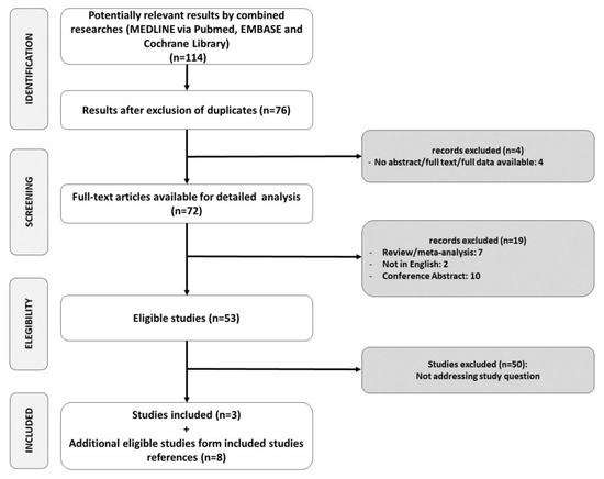 The study selection was performed in multiple phases. In the first phase, potentially relevant studies were obtained by combined searches of electronic databases using the selected abovementioned keywords. Then, studies not in English, with no abstract/full text were excluded. In the second phase, studies were reviewed and excluded by study typology; thus, letters, editorials, case reports, and comments were excluded. The third phase consisted of a detailed analysis of full-text articles to assess whether they addressed the specific study question.