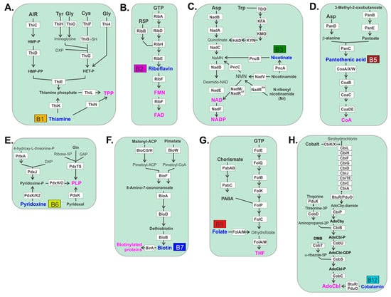 Biochemical pathways for vitamin/cofactor biosynthesis in human gut microbiome. (A) thiamine pyrophosphate (TPP); (B) Flavin MonoNucleotide/Flavin Adenine Dinucleotide FMN/FAD; (C) Nicotinamide Adenine Dinucleotide (Phosphate) NAD/NADP; (D) coenzyme A (CoA); (E) pyridoxal-phosphate (PLP); (F) biotin; (G) tetrahydrofolate (THF); (H) adenosylcobalamine (AdoCbl). Enzymes are shown in white boxes. B-vitamins/cofactors are in blue/magenta text.