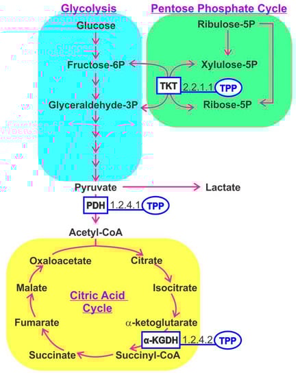 Using Erlich’s ascites tumor model, administration of 25-fold excess compared to FDA guidelines for thiamine increased tumor growth; however, at 2500 times the recommended daily allowance, modest tumor growth inhibition was observed. This attenuation of tumor growth was enhanced when high-dose thiamine was administered 7 days prior to tumor inoculation []. Taken together, these results suggest that thiamine may promote or inhibit tumorigenesis depending on the cancer type analyzed or the effective dose or amount of intracellular TPP.