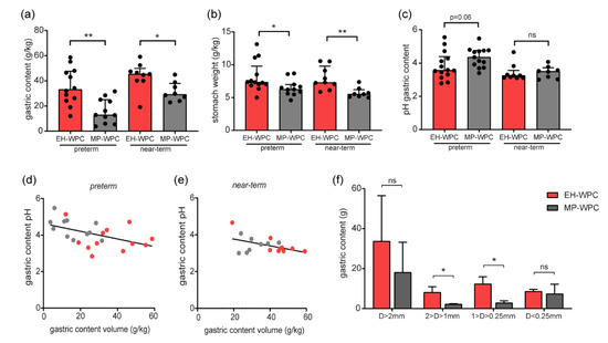 Digestion and coagulation in vivo. (a) gastric content weight and (b) relative weight of the empty stomach (g/kg bodyweight) were measured at day 5 during necropsy, 1 h after the last bolus of EN, with (c) pH levels of the gastric content. (d,e) correlation between gastric content volume and pH levels for (d) preterm and (e) near-term piglets. n = 14 for preterm piglets, n = 8–9 for near-term piglets. * p < 0.05, ** p < 0.01, ns = non-significant based on Mann–Whitney test between EH-WPC and MP-WPC. (f) Gastric content of 6 near-term piglets (n = 3 per diet) was separated based on particle size and weight of separate fractions (g) was recorded. * p < 0.05, ** p < 0.01, ns = non-significant based on t-test between EH-WPC and MP-WPC.