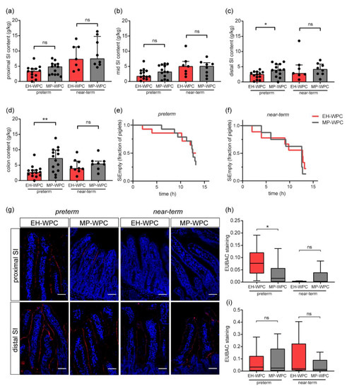 Next, the presence and adherence of bacteria to the intestinal epithelium was evaluated. Epithelial-adhering bacteria were detected by FISH with a probe for eubacteria (Figure 4g). Adherence of bacteria to the proximal SI epithelium in the preterm piglets was higher than in the near-term piglets. In the distal SI, bacteria were identified at the villi of all piglets. Quantification revealed significant lower EUBAC staining intensity in preterm piglets exposed to MP-WPC diet compared with EH-WPC in the proximal SI (Figure 4h), while this effect was absent in the distal small intestinal tissue (Figure 4i).