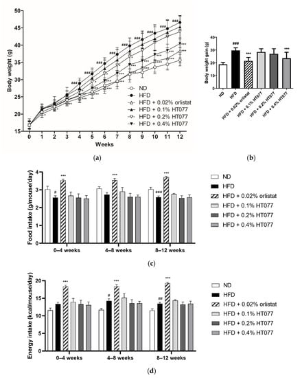 3.1. Effects of HT077 on Body Weight and Food Consumption