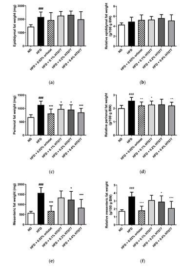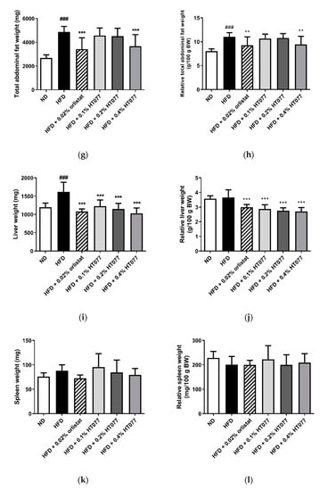 3.2. Effects of HT077 on Abdominal Fat, Liver, and Spleen Wet Weights