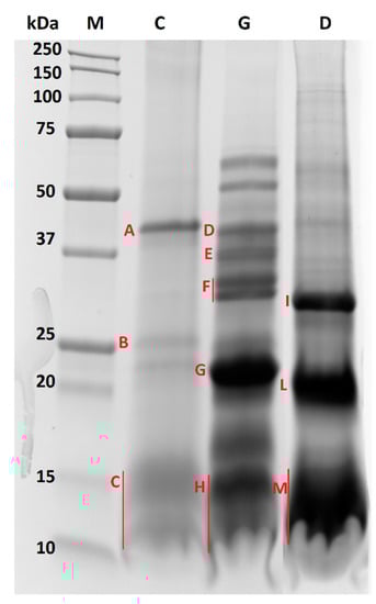 | Digestion Step | Band | Accession | Description (OS = Prunus dulcis) | Coverage (%) | Peptides (Unique) | PSMs | MW (kDa) | Score |