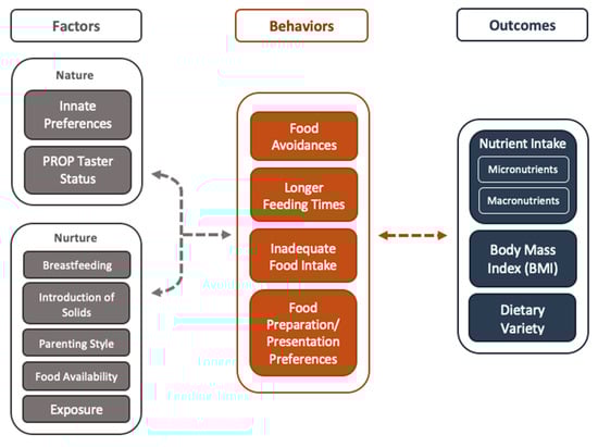 Several factors interact to shape each individual child’s eating behaviors and food preferences [41]. Early experiences including flavor exposure in utero and via breastmilk interact with genetic differences in flavor perception in a complex way to establish food preferences [29,30]. Elements of nurture, such as exposure to various tastes and parental feeding practices, can alter child feeding behaviors that may be based on inherent taste sensitivity. The food environment can also largely impact food preferences. On the other hand, a child’s innate preferences and behaviors, as well as their temperament, can affect nurture components like parenting style and food availability [41]. In their study of fruit and vegetable intake in two to five-year-old children and their mothers, Coulthard and Blissett [9] reported that children who were sensitive to taste/smell stimuli were less likely to model the fruit and vegetable consumption of their mothers. This indicates that the effect of parental modeling of food behavior can be influenced by the child’s sensitivity to taste [9]. Thus, Walton et al. describes picky eating as a bi-directional concept in which parental feeding practices can influence the child’s behavior and vice versa [6]. This is further emphasized in the systematic review conducted by Cole et al., which summarizes the correlates of picky eating behavior and food neophobia in young children. This review outlines the importance of the bi-directional nature of feeding interactions within the child-parent dyad [49]. This knowledge also suggests that factors leading to the development of picky eating behaviors are multidimensional and will vary from child to child. There is limited research on the interaction amongst these various factors in relation to picky eating [64]. Future research and intervention strategies must, therefore, take into account the various combinations of nature and nurture elements at play in the development of picky eating in children and should be individualized.